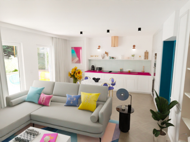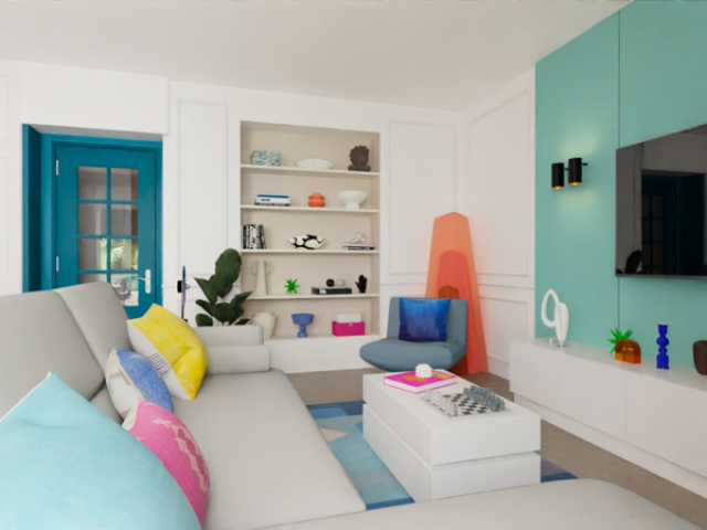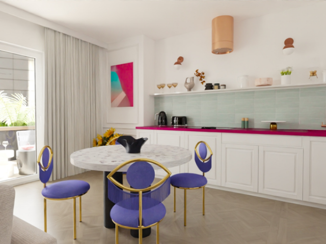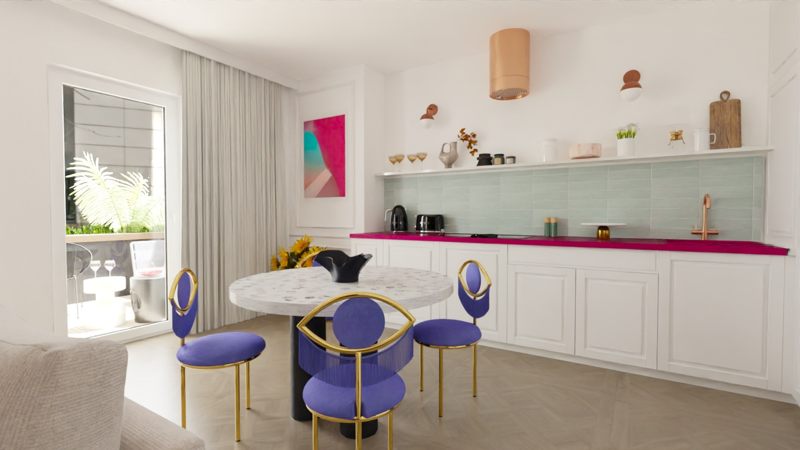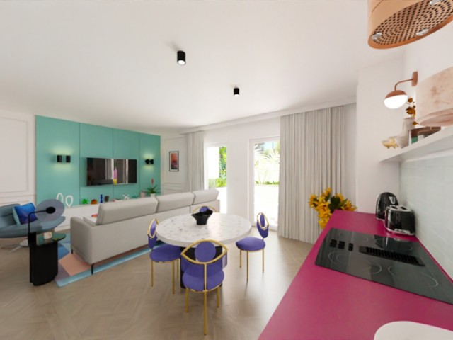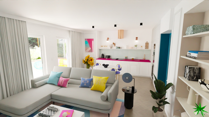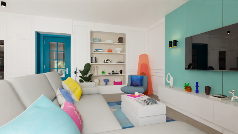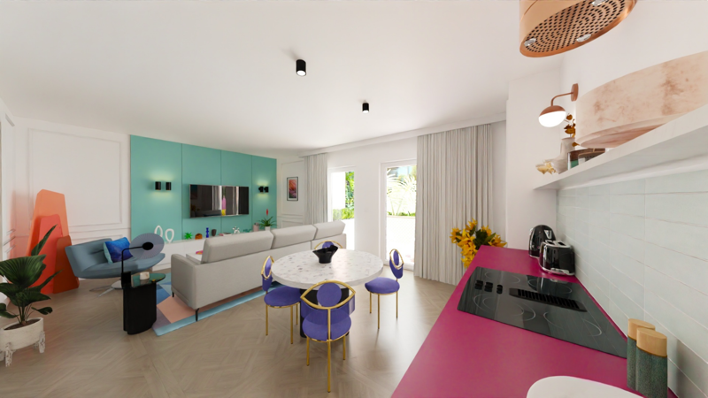 Rénovation entière d'un appartement avec terrasse. Le client voulait intégrer la couleur et donner un air plus moderne à son appartement. Une cuisine ouverte, pas d'île et un salon très coloré ont été les demandes du client, qui a finalement trouvé son bonheur. Pour cette rénovation, on a tenu en compte la revalorisation d'espaces et de matériaux pour une démarche plus écologique. Des matériaux innovants et des éléments décoratifs issus des savoir-faire français font de cet appartement un lieu unique avec beaucoup d'histoires à raconter aux curieux. « La touche de couleur très originale sur le plan travail a été mon coup de cœur » Emily B.