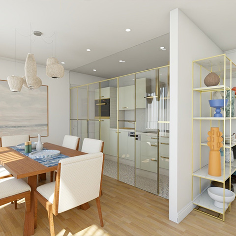 Une rénovation que cherchait de la couleur et de l'élégance pour dénicher le bonheur. Un espace pour admirer notre collection d’art, a été la demande des clients, qui cherchaient à fermer la cuisine pour limiter au maximum que les odeurs et la fumée caractéristiques imprègnent l’espace de partage entre séjour et salle à manger. Pour ce fait, nous avons installé une baie vitrée pour séparer l'espace, mais en laissant passer la lumière naturelle.